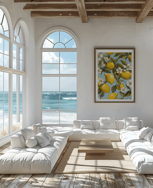 Lemon Botanical Wall Art - Vintage Fruit Print with White Flowers